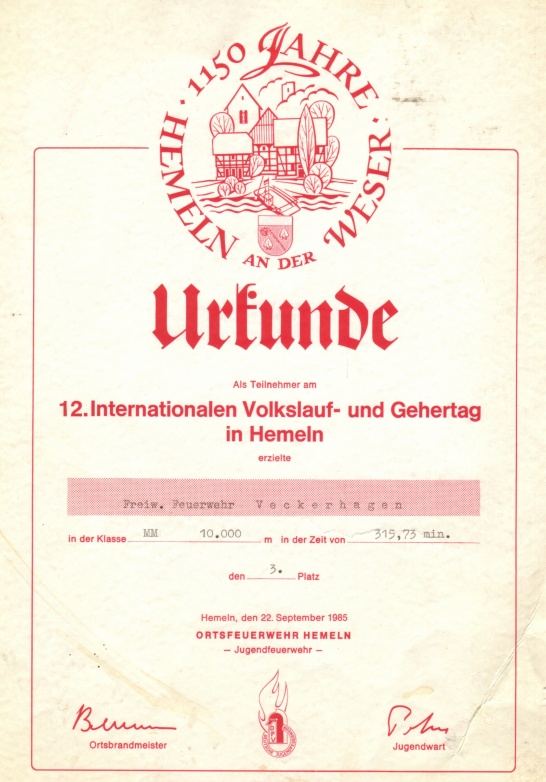Am 22. September 1985 richtete die Jugendfeuerwehr der Ortsfeuerwehr Hemeln den traditionellen Volkslauf aus.