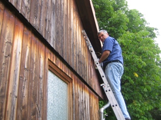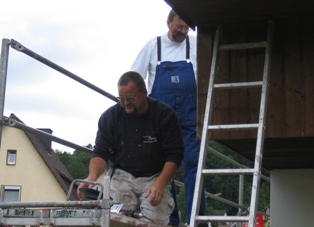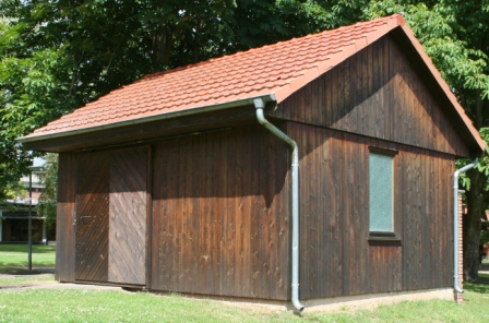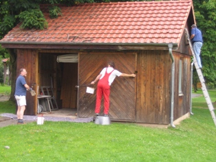 Treffpunkt für alle die helfen wollten war um 17:00 Uhr am Vereinsraum im Ochsenkamp. Zu Beginn wurde als erstes fachmännisch ein Gerüst aufgebaut um die Holzbretter der seitlichen Dachverschalung abzureißen. Die Seite wurde im Anschluss mit Faserzementplatten verkleidet und mit Binderfarbe gestrichen. Das Dach des Vereinsraum wurde in dieser Zeit von Laub und Müll befreit Außerdem mussten noch einige am Vereinsraum und dem Schuppen angrenzenden Bäume zurück geschnitten werden, da die Äste das Dach schon beschädigt hatten. Auf dem Vorplatz wurden einige Gehwegplatten die sich zu einer Stolperfalle abgesenkt haben aufgenommen und wieder ordentlich verlegt. Der Schuppen bekam einen akkuraten Lasuranstrich unter den Augen von Malermeister Peter Rettberg der sein ganzes Fachwissen an die Helfer weiter gab. |