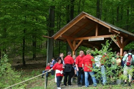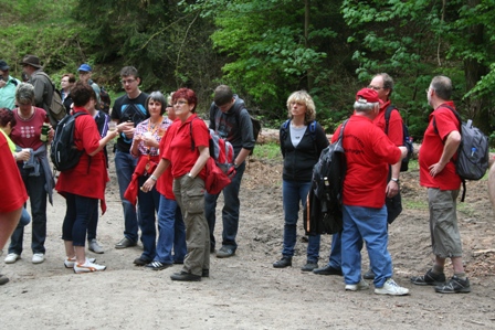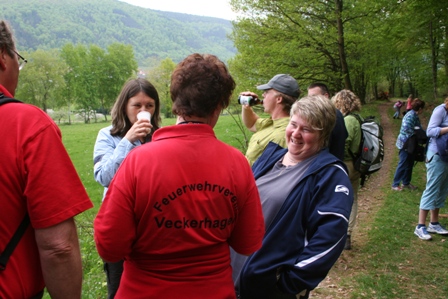 Zu unserer diesjährigen Himmelfahrtswanderung um 09.05.2013 hatten sich über 90 Mitglieder, mit Familie und Freunden, angemeldet. Um 9.30 Uhr fand ein gemeinsamer Gottesdienst im Gemeindehaus der evangelischen Kirche statt. Nach dem Gottesdienst fuhren wir mit dem Bus zum Hallenbad nach Vaake, von hier Begann bei noch schönem Wetter unsere Wanderung vorbei am Hochzeitswald zur Spinnstubenhütte. Die Verpflegung fand wieder „aus dem eigenen Rucksack“ statt, für Getränke unterwegs war bestens gesorgt. Peter Jatho begleitete die Wandergruppe mit seinem Transporter und machte an mehreren Stationen halt um die durstigen Wanderer zu versorgen. Im weiteren Verlauf der Wanderung ging es vorbei am Geröllfang „Habichtsbach“ und vorbei am Aasbrunnen in Richtung Freibad Veckerhagen. Bei unserer letzten Wanderetappe vom Waldrand zur Feuerwache wurden wir dann leider doch noch nass.