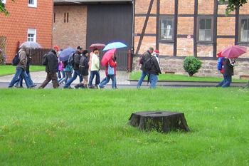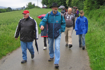 Zu unserer diesjährigen Himmelfahrtswanderung am 29.5.2014 hatten sich wieder über 90 Personen, Mitglieder sowie deren Familien und Freunde, angemeldet. Nach einem gemeinsamen Gottesdienst in der Evangelischen Kirche Veckerhagen ging es los. Die Strecke musste kurzfristig geändert werden denn bei einer Wanderung zur Bramburg war zu bedenken ob die Fähre fahren würde, da die Weser durch den anhaltenden Regen Hochwasser führte. Von der Kirche aus ging es deshalb auf der Veckerhäger Seite Richtung Bruchweg und weiter zum Forsthaus Ziegelhütte. Der Rückweg führte uns auf dem Weg durch den Wald zurück in den Ort zur Feuerwache. Die Verpflegung fand aus dem “eigenen Rucksack” statt. Für Getränke unterwegs wurde wieder bestens gesorgt.