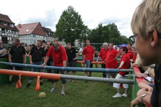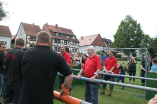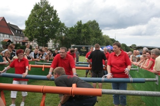 Der Feuerwehrverein Veckerhagen nahm anlässlich der Weserbeleuchtung am Menschenkickerturnier 2011 teil. Leider musste der Feuerwehrverein Veckerhagen nach dem ersten Spiel gegen eine Auswahlmannschaft der Stammtischbrüder und den Reservistenkameraden Reinhardshagen ausscheiden. Unser Team konnte in 10 Minuten Spielzeit ein 1:1 unentschieden erkämpfen aber beim Fünfmeterschießen fehlte das Glück um eine Runde weiter zu kommen. Unser Coach Peter Rettberg bedankte sich im Anschluss bei den Spielerinnen und Spielern für die tolle Leistung mit einem Erfrischungsgetränk. Die Manschaft setzte sich wie folgt zusammen: Jens Raddatz, Berti Heidl, Peter Jatho, Stefan Schütte, Christa Rettberg und Elke Schachtebeck |