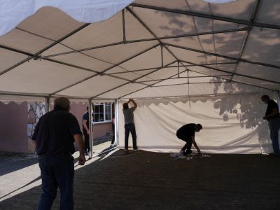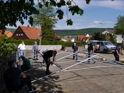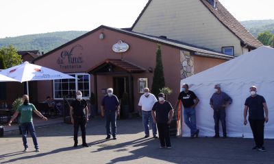 In diesen für Gaststätten schweren Zeiten hat uns Jens Gerth darauf aufmerksam gemacht, dass unser beliebtes italienisches Restaurant "Da Vinci" sein Platzangebot erweitern müsse, um wirtschaftlich arbeiten zu können. Unser Vorsitzender Karl-Heinz Gast bot umgehend Hilfe an und stellte sein privates Partyzelt zur Verfügung. Gemeinsam mit den Kameraden Peter Jatho, Robert Heidl, Peter Rettberg, Günter Meinhard, Wolfgang Frieberg und Jens Gerth sowie Vinzenzo Garofalo und Domenico Cappussi aus dem Da-Vinci-Team begann am Montag, 18.05.2020 Nachmittag der Zeltaufbau. Nach 2 Stunden stand das Zelt fest und es bietet ab Dienstag zwanzig Gästen Platz und Schutz vor Regen. Der Aufbau fand unter Corona-Schutzmaßnahmen mit Mundschutz und unter Einhaltung der Abstandsregeln statt. Der Wirt spendierte anschließend noch Getränke und Karl-Heinz Gast hielt eine kurze Ansprache und wünschte, dass dieser Einsatz des Feuerwehrvereins Veckerhagen dazu beitragen wird, dass die Trattoria Da Vinci die Corona-Zeit gut übersteht.